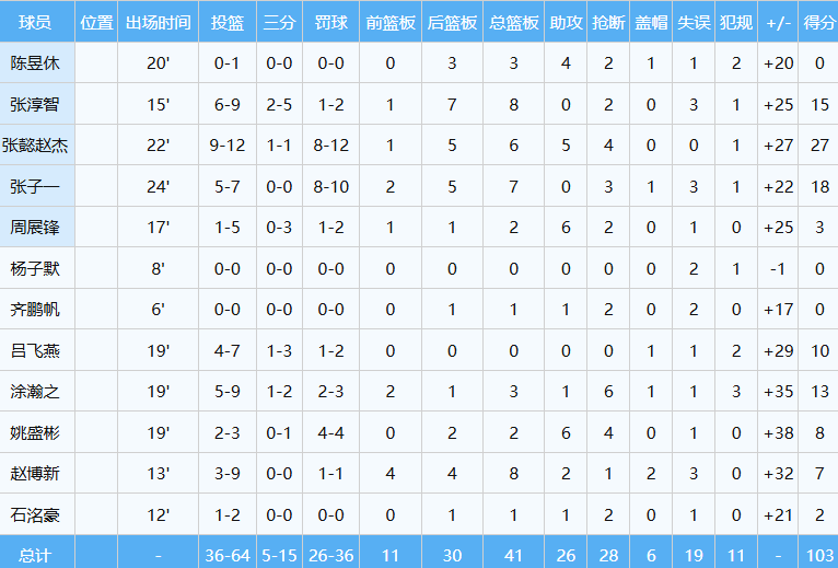 中国男篮12人全部披挂上阵,其中5人得分上双,(13号)张懿赵杰22分钟轰下27分外加6板5助4断,(11号)张淳智15分8板2断,(14号)张子一18分7板3断,(12号)吕飞燕10分,(9号)涂瀚之13分3板1助6断。